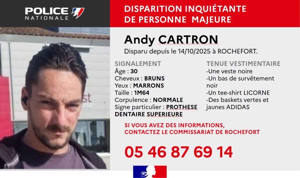 Toute personne disposant d’informations susceptibles d’aider les enquêteurs ou ayant vu Andy Cartron est invitée à contacter le commissariat de Rochefort au 05 46 87 69 14.