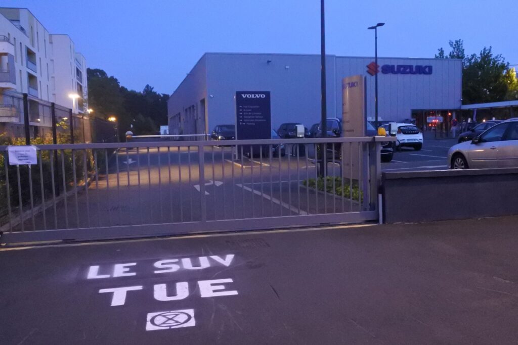 Dans la nuit du vendredi 13 au samedi 14 juin 2025, à Angers, le mouvement Extinction Rebellion a organisé une action de désobéissance civile non-violente contre les SUV, à l’occasion des journées Portes Ouvertes de la concession Val de Loire Automobile (Suzuki et Volvo).