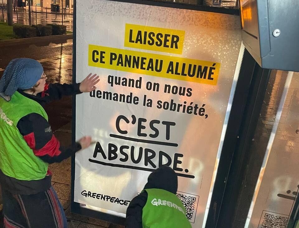 Action de Greenpeace contre les panneaux publicitaires allumés la nuit à Angers.